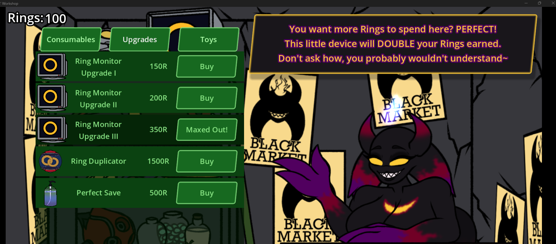 bug? after buying the max ring monitor upgrade. left shop collected rings twice went back in to check upgrades and all 3 were there. buying the lower level upgrade sets the monitor back to that level and must buy all the upgrades for it again.